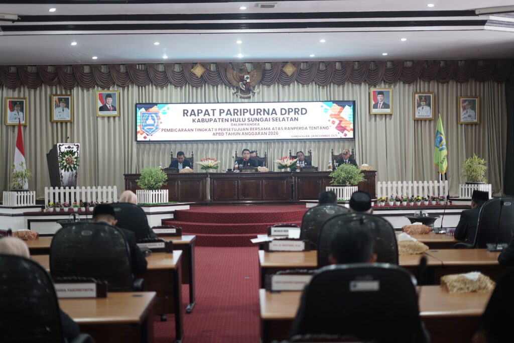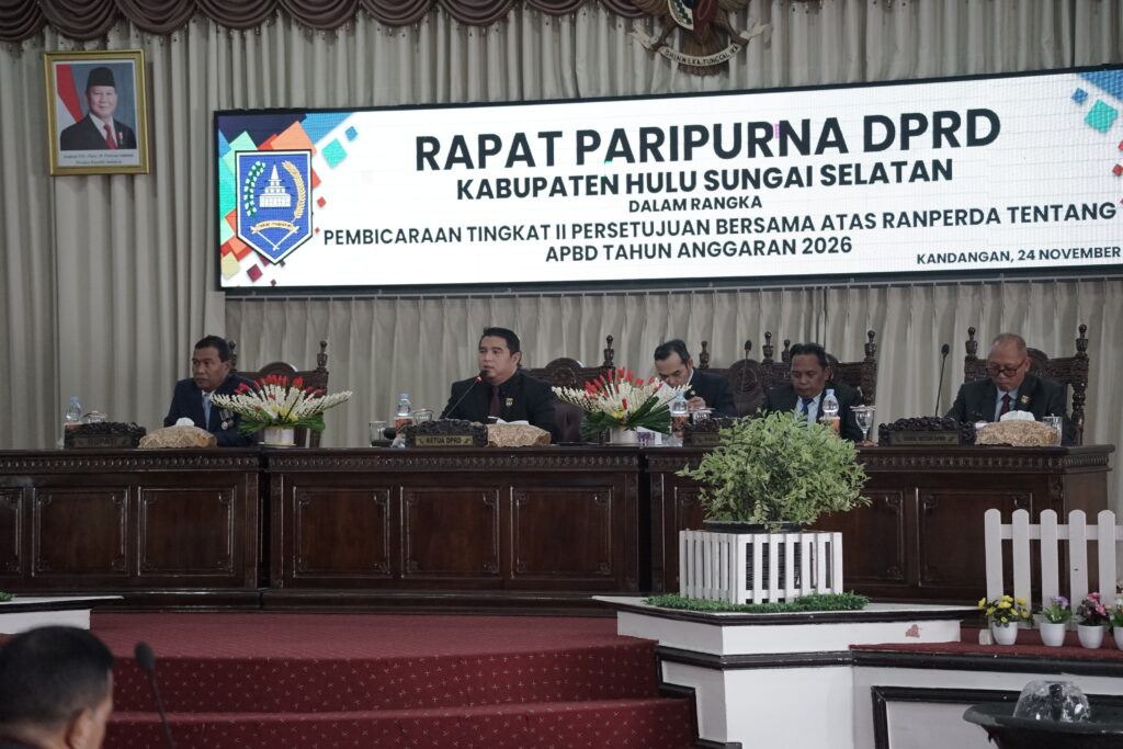 Dewan Perwakilan Rakyat Daerah (DPRD) Kabupaten Hulu Sungai Selatan (HSS) kembali menunjukkan komitmennya dalam mengawal arah pembangunan daerah melalui persetujuan bersama atas Rancangan Peraturan Daerah (Ranperda) tentang APBD Tahun Anggaran 2026. Persetujuan ini diberikan dalam Rapat Paripurna Pembicaraan Tingkat II yang digelar pada Senin (24/11) di Aula Rapat DPRD Kab. HSS.