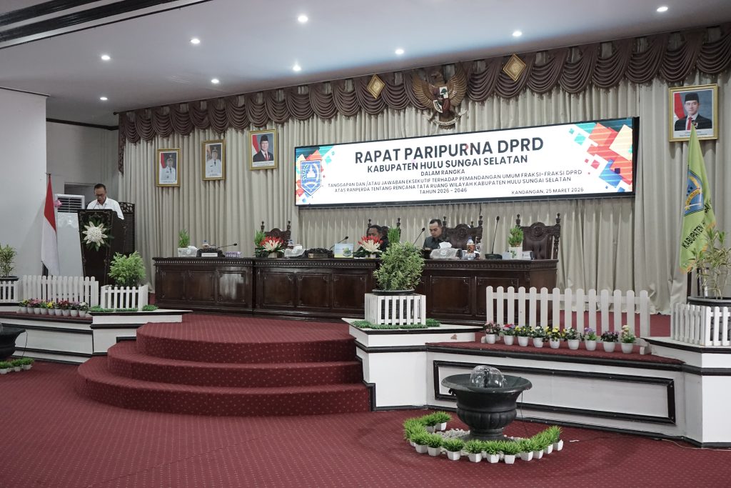 Hulu Sungai Selatan – Dewan Perwakilan Rakyat Daerah (DPRD) Kabupaten Hulu Sungai Selatan kembali melaksanakan Rapat Paripurna dalam rangka mendengarkan tanggapan atau jawaban eksekutif atas pemandangan umum fraksi-fraksi DPRD terhadap Rancangan Peraturan Daerah (Ranperda) tentang Rencana Tata Ruang Wilayah (RTRW) Kabupaten Hulu Sungai Selatan Tahun 2026–2046.