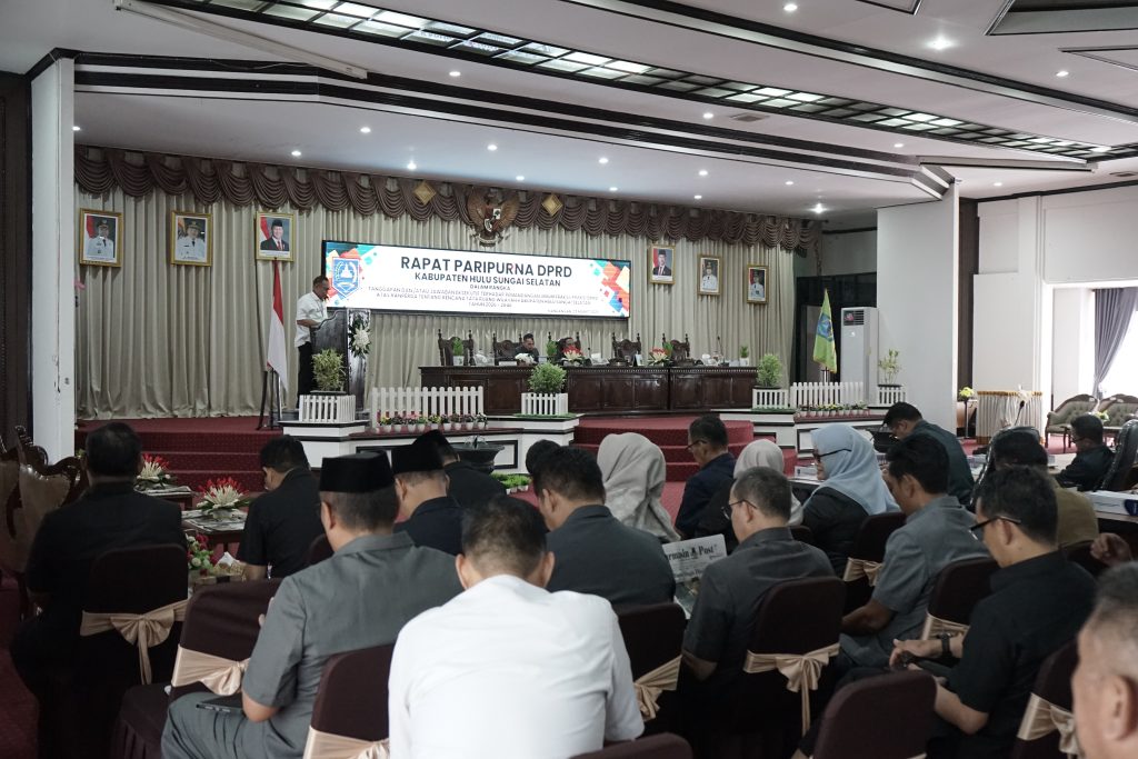 Rapat Paripurna yang digelar di ruang sidang utama DPRD Kabupaten Hulu Sungai Selatan tersebut dipimpin langsung oleh Wakil Ketua I DPRD, H. Husnan, S.Ag, serta dihadiri oleh para anggota DPRD Kabupaten HSS. Turut hadir Sekretaris Daerah Kabupaten Hulu Sungai Selatan, Drs. H. Muhammad Noor, M.AP, bersama jajaran Pemerintah Kabupaten HSS, meliputi para Asisten, Staf Ahli, dan Kepala Perangkat Daerah.