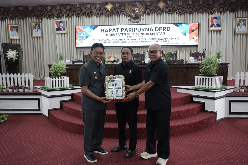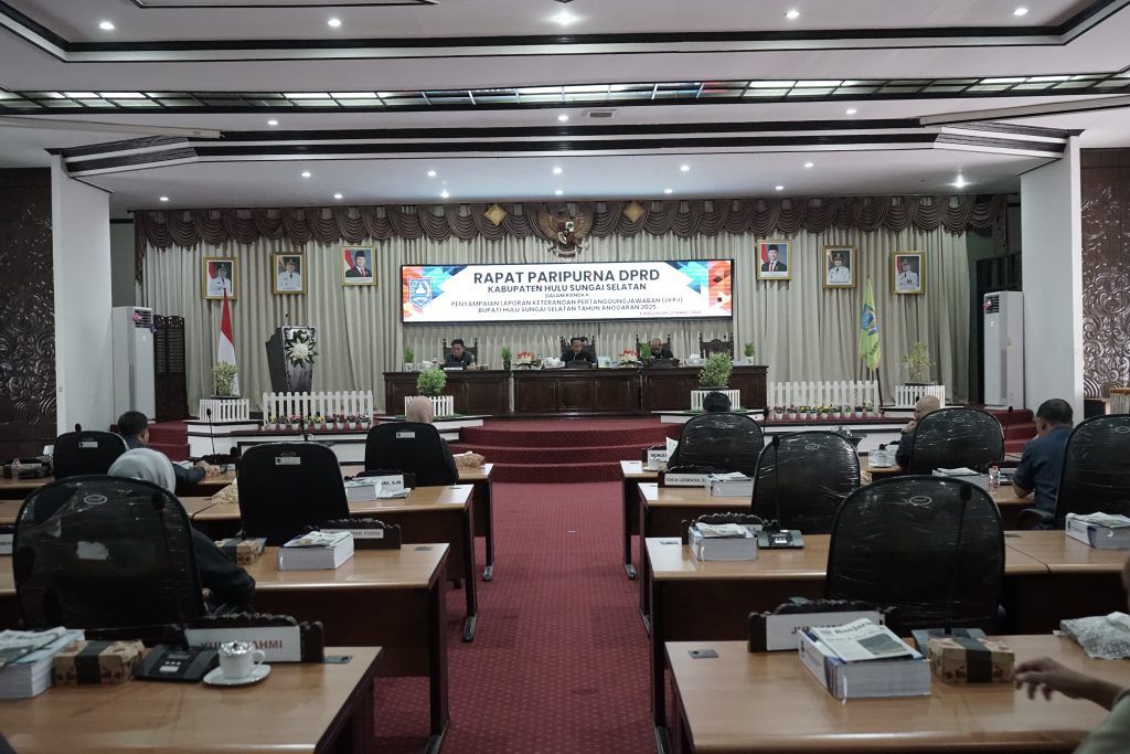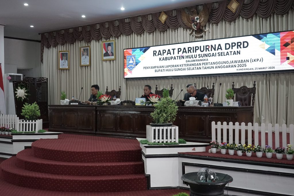Hulu Sungai Selatan – Dewan Perwakilan Rakyat Daerah (DPRD) Kabupaten Hulu Sungai Selatan menggelar Rapat Paripurna dalam rangka penyampaian Rekomendasi DPRD atas Laporan Keterangan Pertanggungjawaban (LKPJ) Bupati Hulu Sungai Selatan Tahun Anggaran 2025, bertempat di ruang rapat lantai 2 Gedung DPRD Kabupaten HSS, Rabu (25/03).